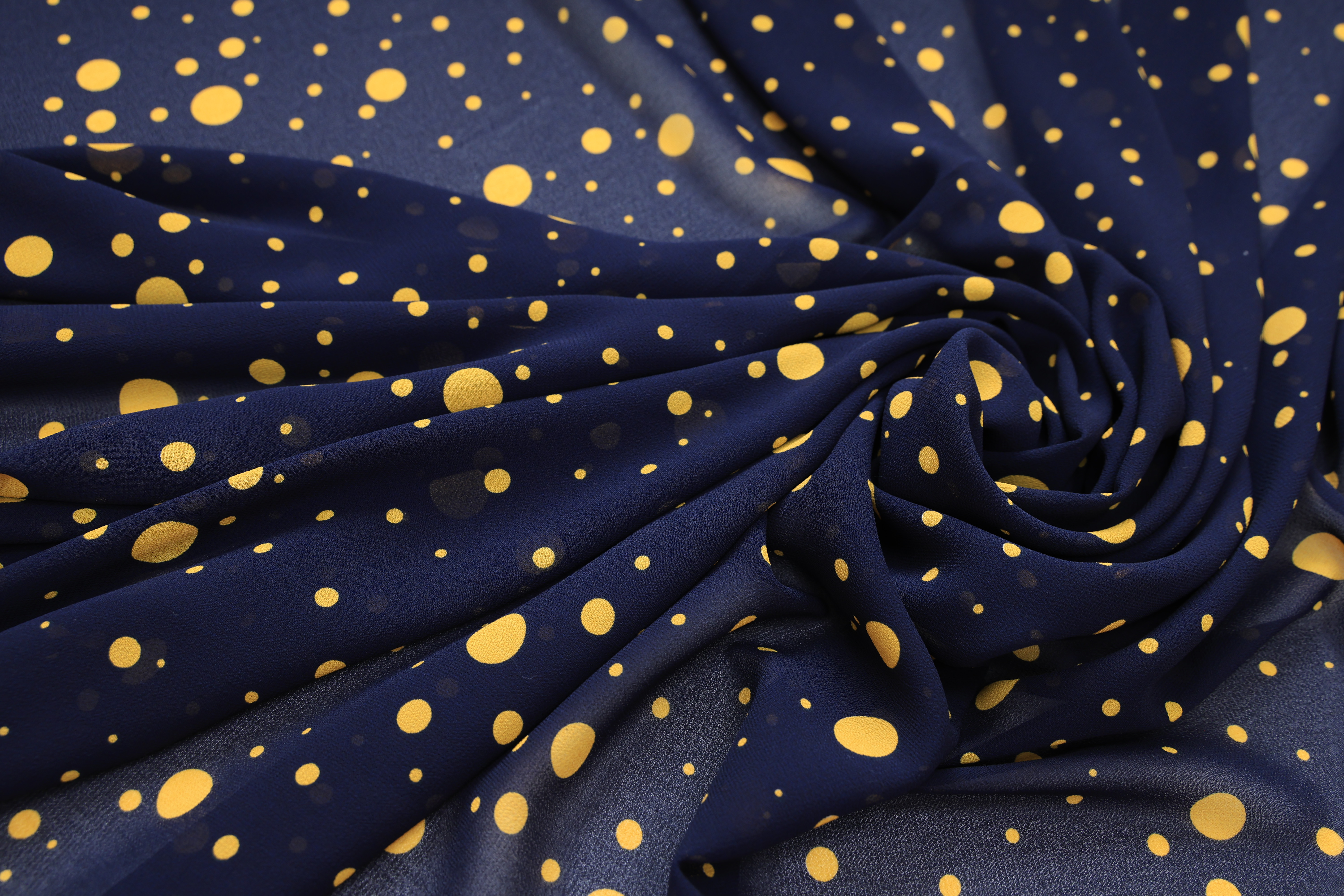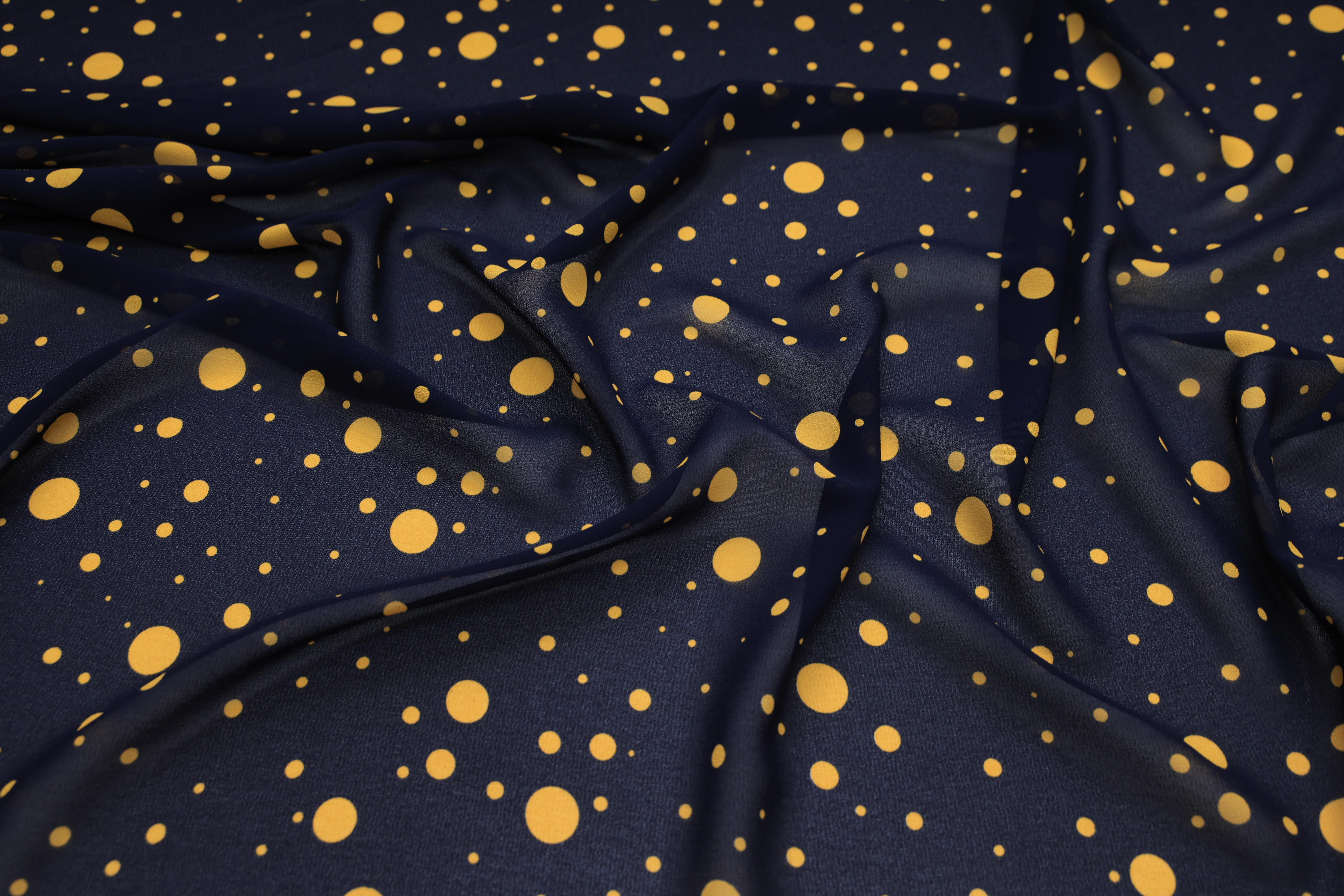 Креп-жоржет темно-синий в желтый горох